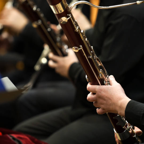 Bassoons in the hands of musicians closeup
